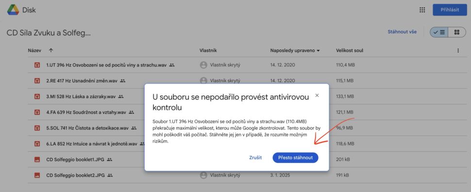 3. U větších souborů - wav, se vám může zobrazit ještě varování, že Google nemůže provést antivirovou kontrolu.